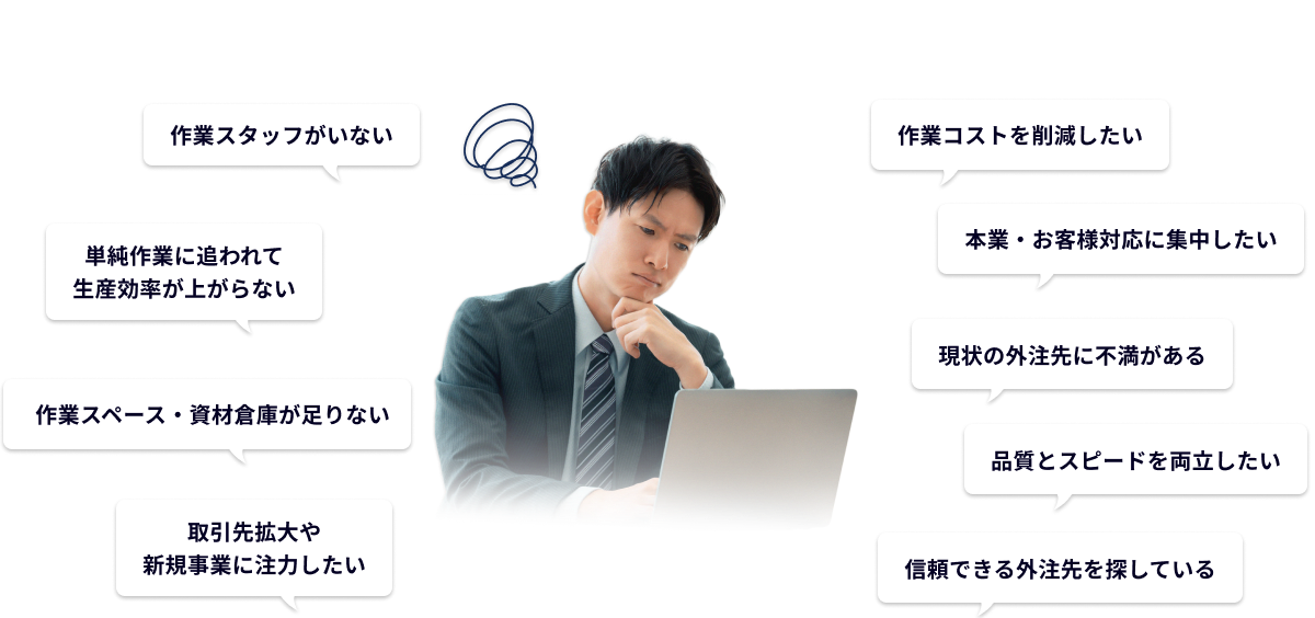 | A | 人の手でしかできない細かい仕事を中心に承ります。 セットアップ作業や梱包・封入作業など面倒な作業をまるごと一括して請け負いますのでお気軽にご相談ください。 |